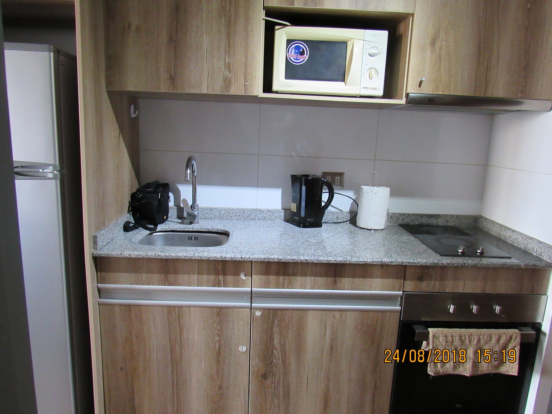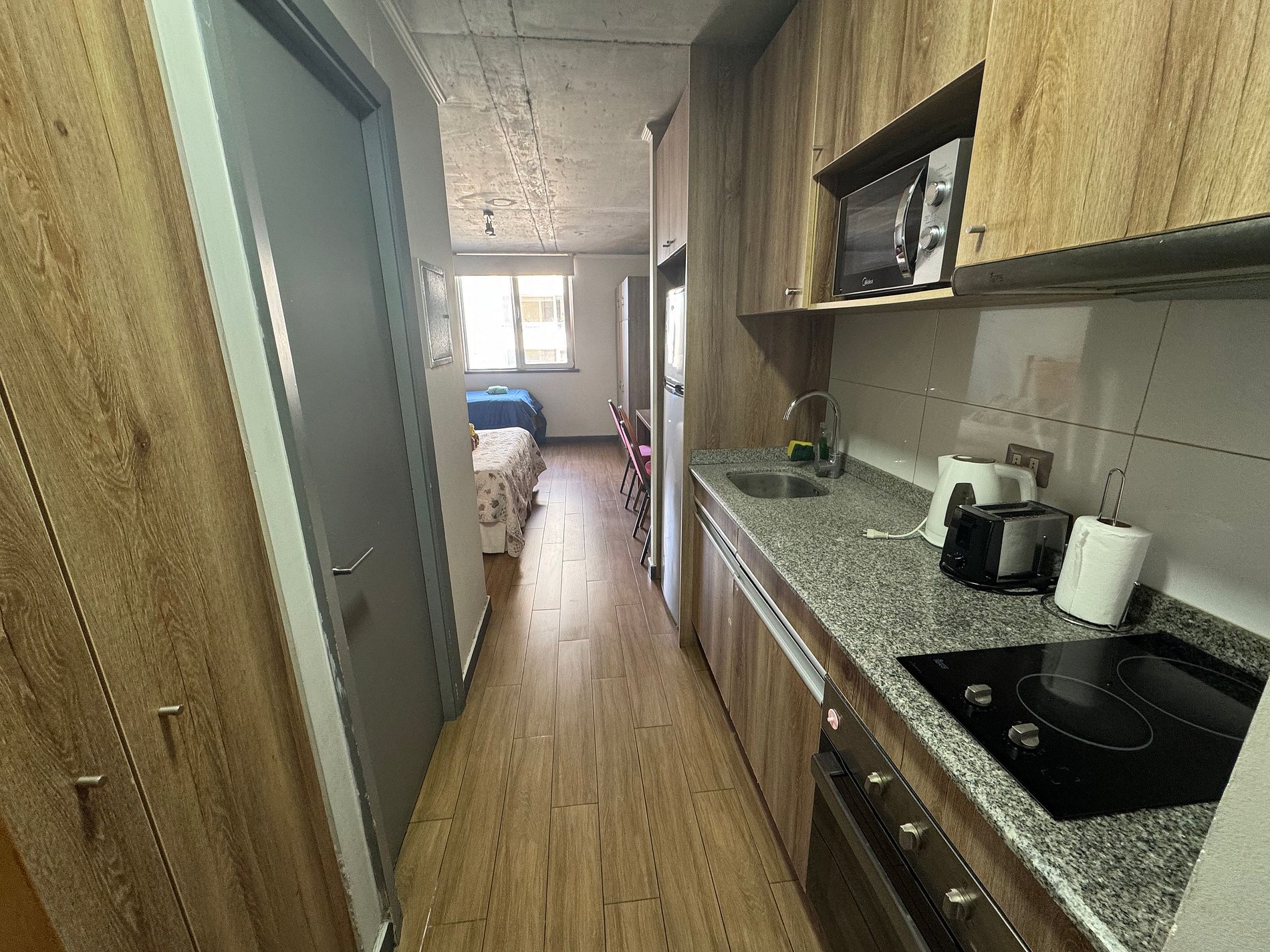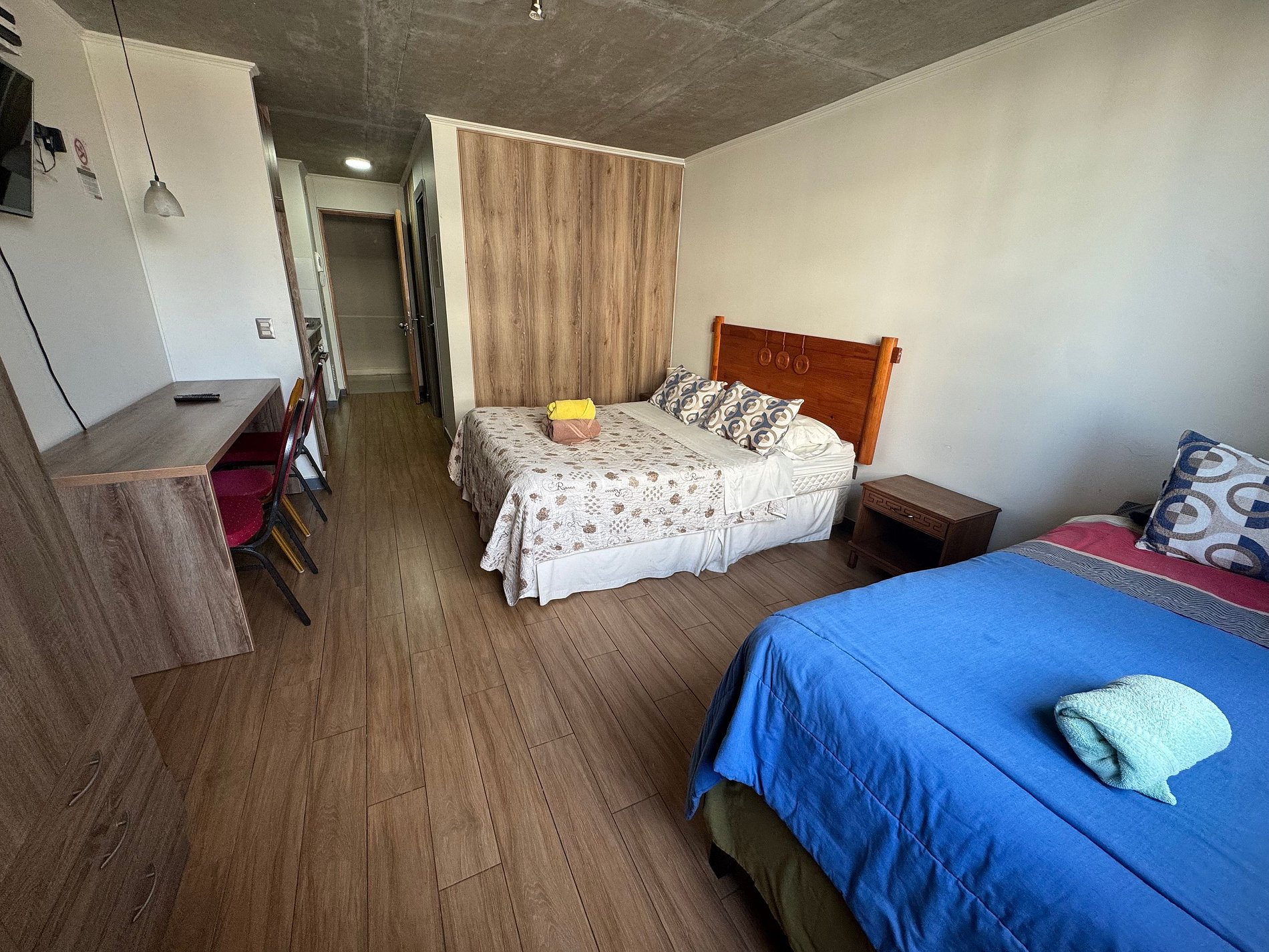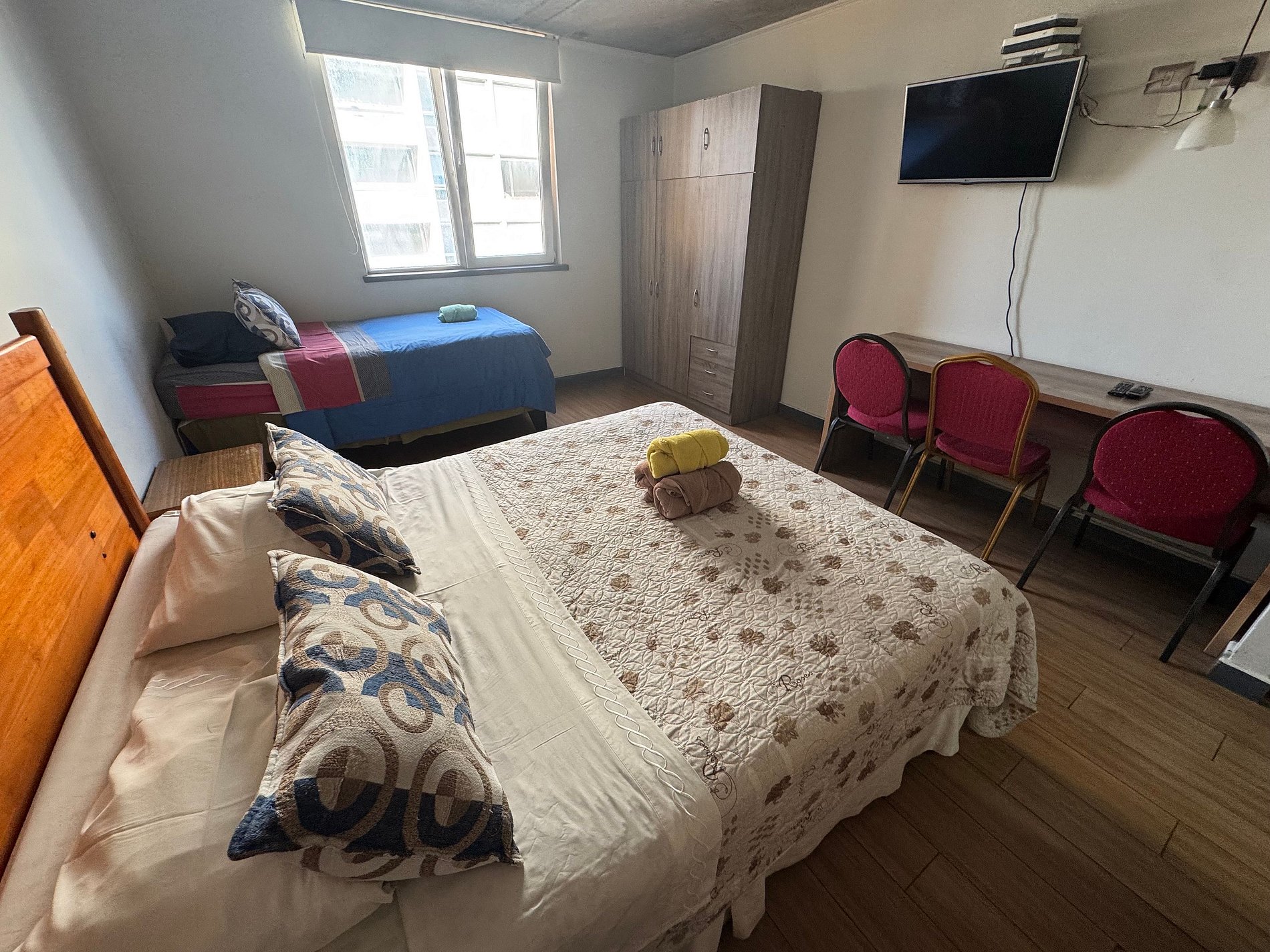 Este cómodo departamento estudio cuenta con una cama matrimonial y una cama individual, ideal para 2-3 personas. Además, dispone de wifi, televisión, armario amplio, cocina totalmente amoblada y un baño completo para tu comodidad.