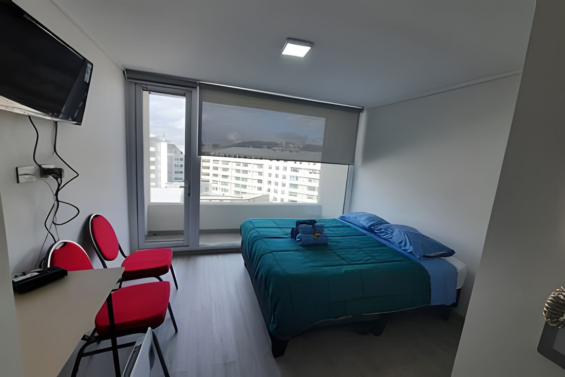 Depto. estudio de un ambiente, cuenta con una cama de 2 plazas, con balcón, ubicación central y tranquila a metros de AV. Alemania.